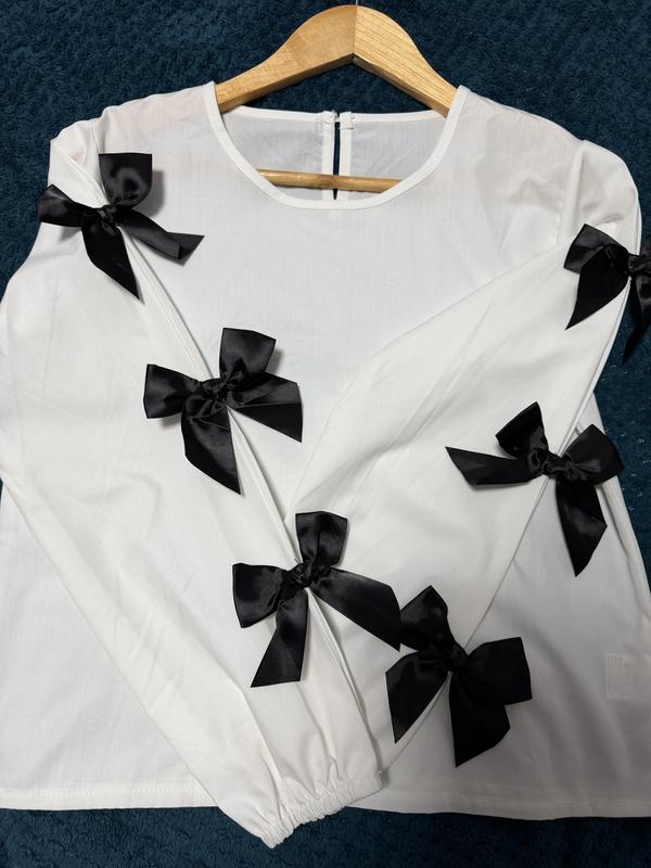 Блуза на дівчинку прямого крою, з бантиками. НОВА! Замовила дочці на Тему (за 515 грн), але не підійшов розмір. Груди 45 см Талія 45 см Стегна 45 см Довжина 50 см Довжина рукава 55 см