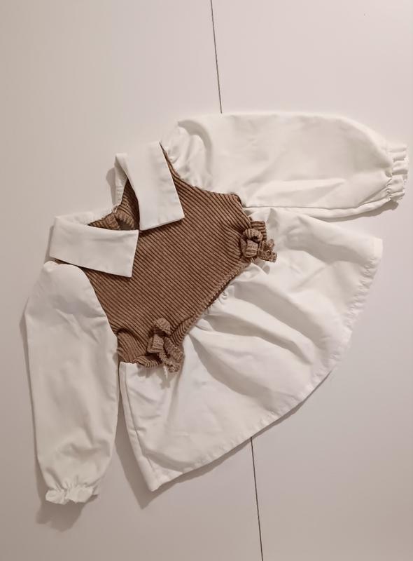 Белая хлопковая блуза с отложным воротником и пышными рукавами, дополненное контрастным коричневым элементом в рубчик, напоминающим корсет. Модель украшена декоративными бантиками по бокам, что придает образу романтичности.