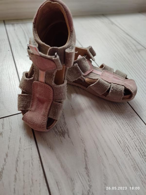 Замшеві+ шкіряна устілка, ззаду на одному босоніжку слід від скотчу ( в магазині ціна була приклеїна). Ходила не довго,прала один раз. На устілку 18- 18,5 см