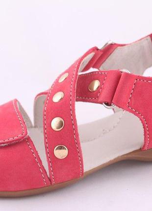 Нові шкіряні босоніжки красивого малинового кольору для дівчинки , ТМ « БЕРЕГИНЯ » Матеріал верху: натуральна шкіра, всередині – натуральна шкіра, шкіряна ортопедична устілка з супінатором. Босоніжки застібаються на дві липучками. Передня частина босоніжок на липучці і дозволяє їх відрегулювати по повноту ніжки. Підошва з зносостійкої термопластичної гуми. Виміри для розміру 26: Довжина устілки: 17,5 см Виміри для розміру 27: Довжина устілки: 18,0 см Виміри для розміру 29: Довжина устілки: 19 см Виміри для розміру 31: Довжина устілки: 20,9 см Виробник : Україна ТМ Берегиня.
