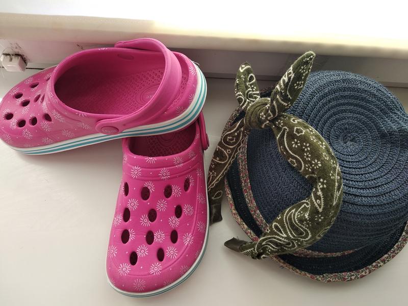 Набір із трьох позицій. Все в дуже гарному стані, розвантажуємо гардероб. Покупилося все окремо, тому якщо щось не підходить Можу продати за одиницею. Крокси, р.31, довжина устілки 19 см. Панамка й обруч 3-6 років. З'явиться за нові речі, тому що не заношені та в акуратному стані, copy видно на фото.