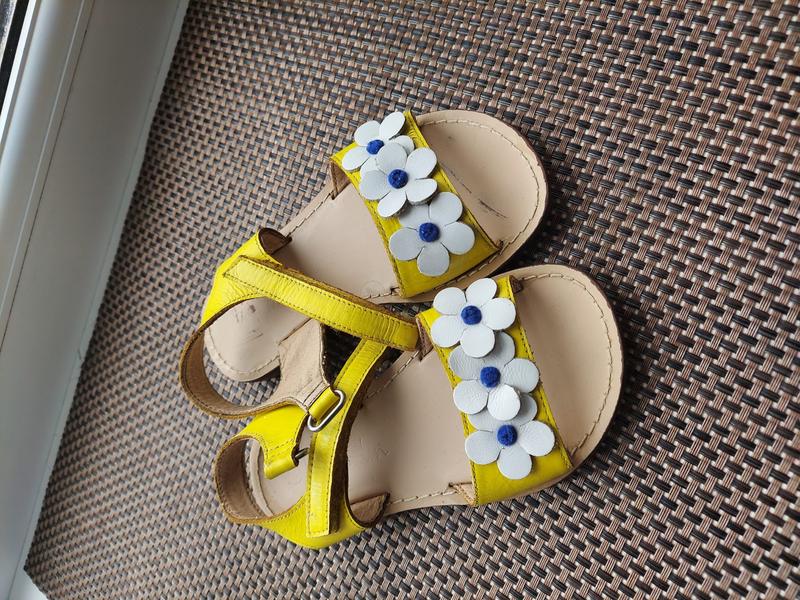 Жовті, застібки на ліпучках(легко вдягати дитині і тримають сильно), 28розмір, стелька 18см. Шкіряні,легенькі,зручні реально, нічого не бояться, біля дому бігати просто супер. З верху на самих босоніжках ідеальні, на стельці трішки поцарапані.За деталями звертайтесь у приват.