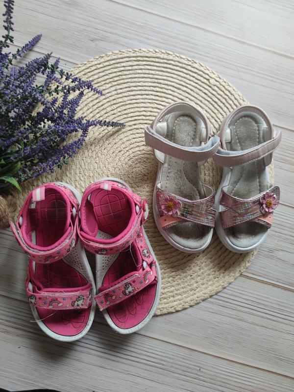 2 пари босоніжок 30 розміру на дівчинку. Стан обох на 4/5, ніде не потерті, не збиті, але були в носці. Дуже зручні, жодного разу не натерли. Регулюються під ніжку ідеально, підійдуть і на худеньку і на більш повнішу ніжку. Фото на ніжці додала (див останні фото). Устілка рожевих від краю до краю 20 см, але ідеально будуть на ніжку 18,5-19 см (на фото ніжка 19 см) Устілка світліших 19 см, на ніжку 18,5 будуть як раз (на фото ніжка 19 см). Ціна вказана за 2 пари.