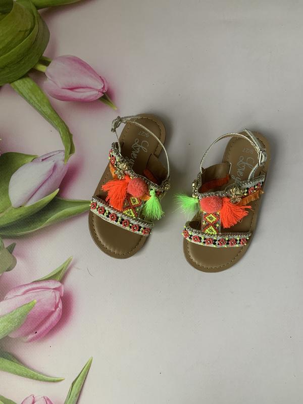 Красиві,яскраві босоніжки,декоровані бісером Розмір 26-27(вказаний 9/27)довжина устілки від краю до краю 17см.