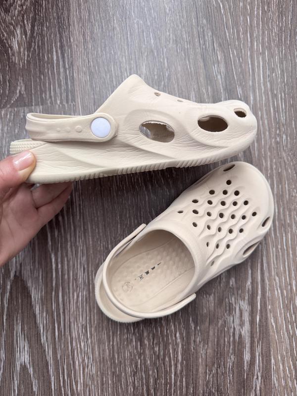 Дитячі крокси , дуже легенькі і зручні в розмірі 30-31. Бежевий колір чудово підійде як для хлопчика так і для дівчинки. Устілка приблизно 17,5-18 см. Чудово миються і швидко сушаться. Мають малесенький дефект на задничку одного крокса, що зовсім не впливає на якість і зручність використання .
