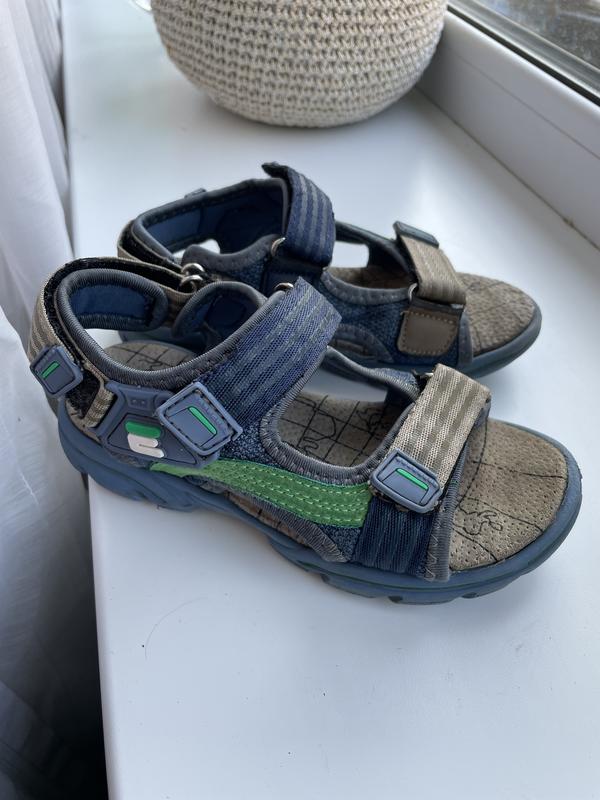Сандалі дитячі літні для хлопчика, розмір 29, відкрита модель із трьома липучками — зручна фіксація на ніжці. Колірна гама — синій із сіро-бежевими вставками. Легка підошва з рельєфом забезпечує зчеплення. Стан взуття хороший, є сліди носіння, але без критичних дефектів