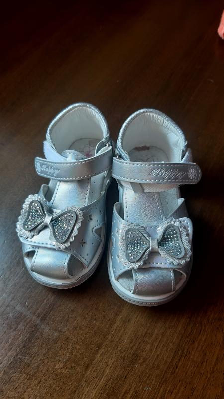 Нові, зручні, дуже гарні босоніжки для дівчинки, 22 розміру (довжина устілки 13,5 см), сріблястого кольору. Твердий заднік, супінатор, ширина регулюється двома застібками.
