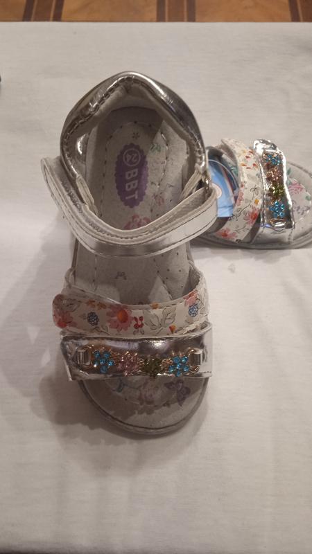 Легкі босоніжки сріблястого кольору для дівчинки - ідеальна модель для комфортних літніх прогулянок. Матеріал верху - еко-шкіра, підошва - рівна з невеликим каблучком, гумова, білого кольору. Модель з відкритим носком і красивим відбитком підошви - у вигляді квіточок і метеликів. Всередині - устілка з супінатором. Спереду застібаються на дві липучки, за допомогою яких також можна регулювати розмір по повноті. Босоніжки спереду і по устілці декоровані барвистим квітковим принтом, а на носку - квітами з страз. Комфортна і неймовірно легка модель - те, що потрібно навіть для тривалих прогулянок на свіжому повітрі. Поєднується з абсолютно будь-якими речами дитячого літнього гардеробу. Підійде як на кожен день, так і для свята, устілка шкіряна