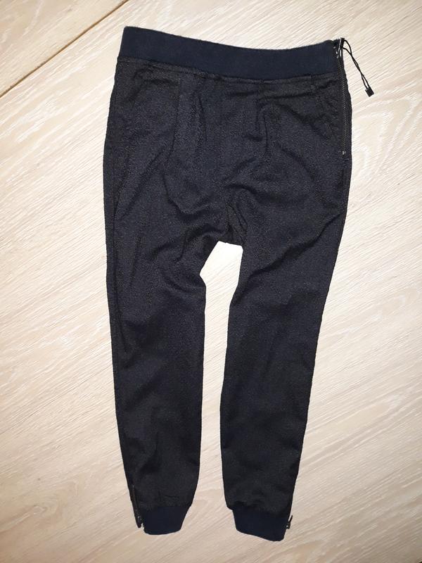 Фірмові, штани, брюки, джоггери з еластичним поясом і блискавками з боків і з обох боків на 7 років, не тонкі Склад 65% поліестер, 33% віскоза та 2% еластан. Стан ідеальний Виміри: довжина 70,5 см, кроковий шов 49 см, талія 30 см, попа 37 см, посадка 21,5/28 см, ширина штанини біля маті 21,5 см, ширина резиночки внизу 10,5 см