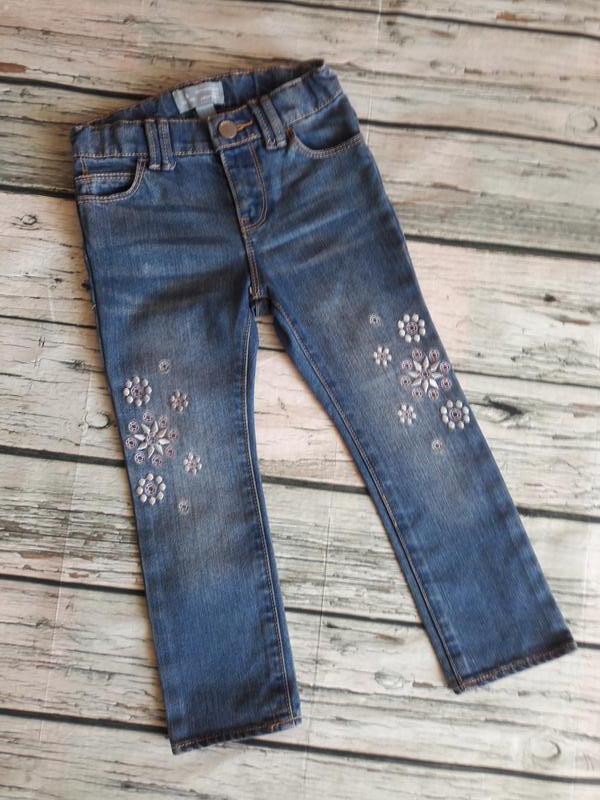 Джинси для дівчинки, попереду вишивка, 2кармана попереду і 2 ззади, пояс під ремінь і гумка всередині. Довжина виробу-56 см, напівобхват талії 26 див.