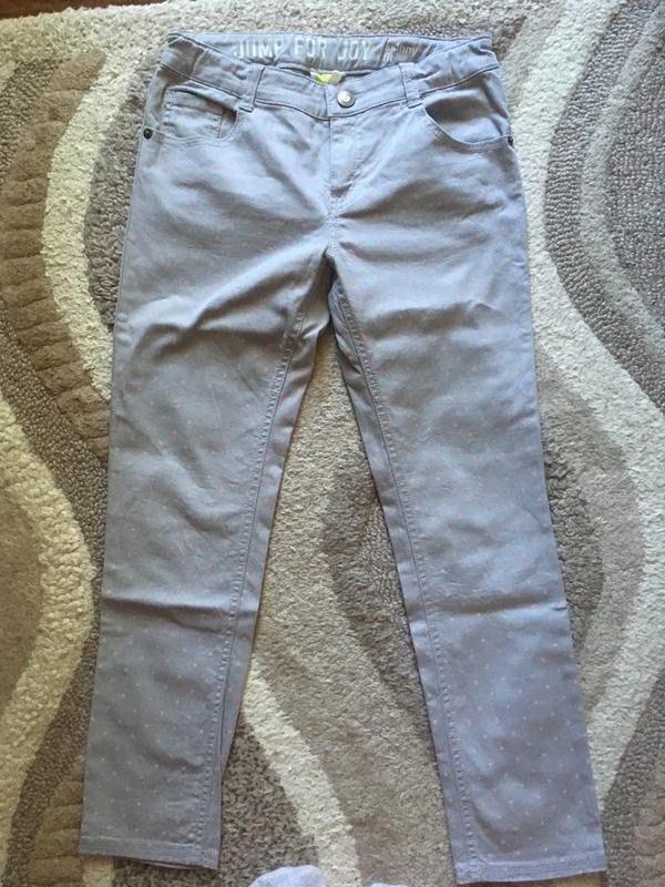Світло сірі джинси в крапочку,довжина 7/8,розмір 12р/152,в поясі стяжка. Якісний котон ,