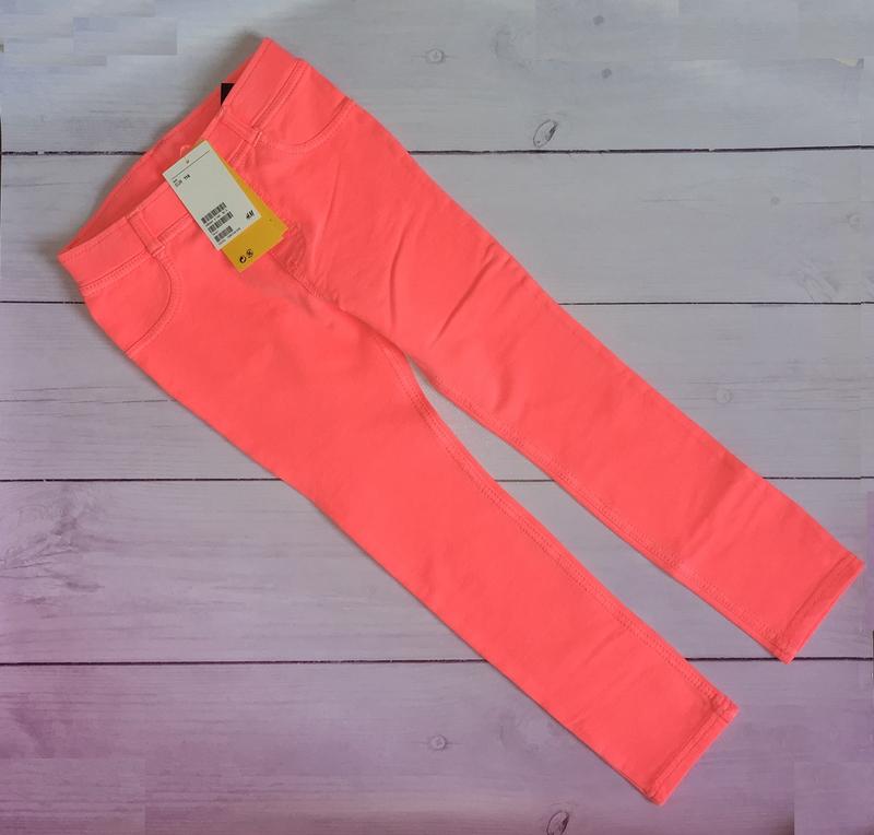Треггенсы H&M Кольори: рожевий неон. Розмір 5-6 років Дуже добре тягнуться. Колір: Рожевий неон Заміри: довжина по зовнішньому шву 65,5 див., кроковий шов 45см. напівобхват талії 25см. напівобхват стегон 29см. посадка спереду 19,5 див. посадка ззаду 22см. ширина штанини зверху 16см. ширина штанини снизу10см.