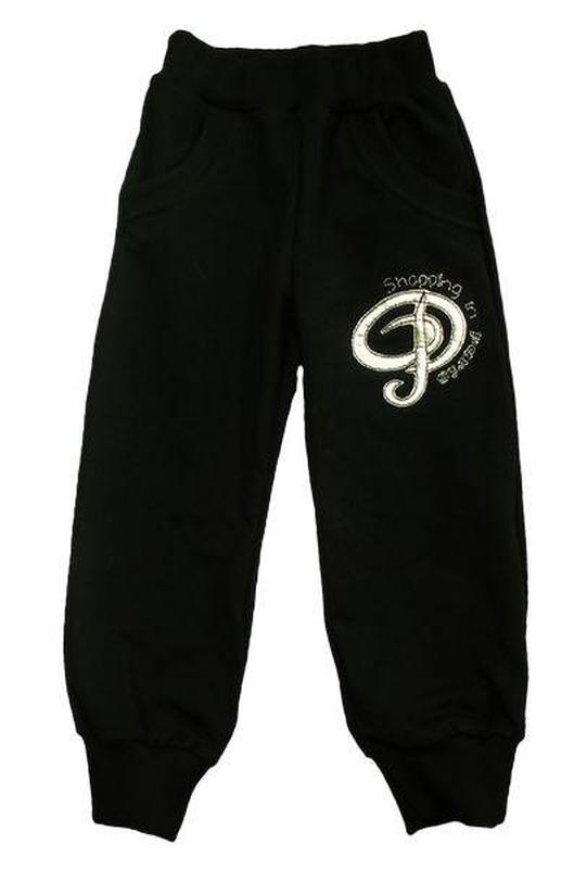 Спортивні штани для дівчинки з трикотажного полотна, пояс на м'якій широкій резинці. Прикрашені вишивкою, низ виробу на манжетах. Колір: Чорний; Полотно: Футер без начісування; Склад: 95% бавовна, 5% еластан; Оформлення: Вишивка; В наявності ріст 98, 104