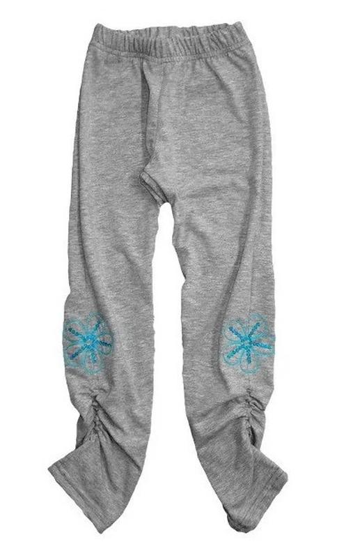 Красиві лосини для дівчинки рівного покрою з присбором за бокама, прикрашені вишивкою з паєтками. Невід'ємна річ у гардеробі юної модниці. Колір: Сірий меланж; Полотно: Стрейч-кулір; Склад: 95% бавовна, 5% еластан; Оформлення: Паєтки;