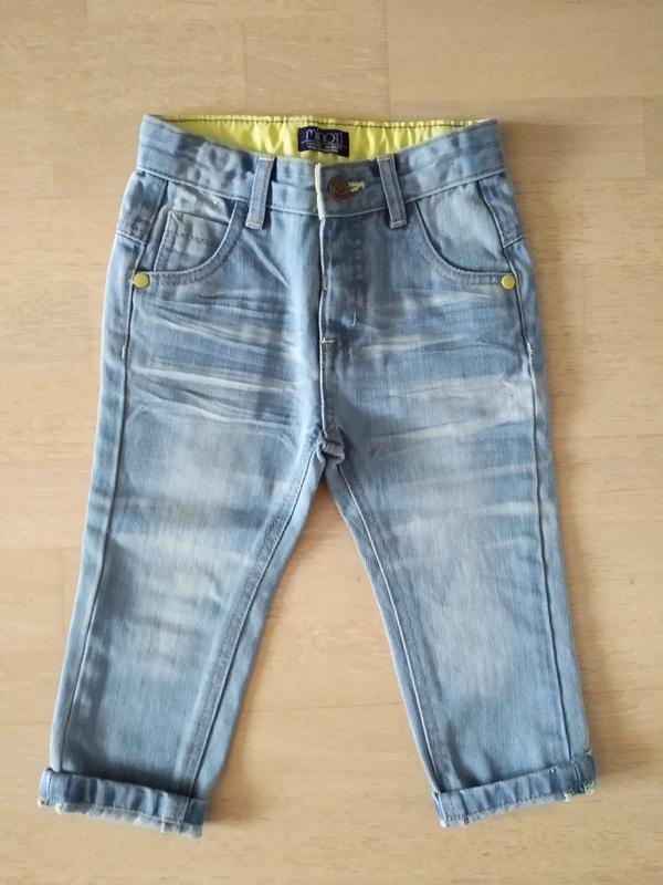 Стильні вибілені джинси завужені до низу. Декоровані 5 кишенями, салатовими кнопками і рядками. Всередині резинка -утяжка Розмір вказаний 80-86см, большимерит на92 - 98см орієнтуйтеся по замірах Довжина зовнішнього/внутрішнього швах-50/31,5 см Посадка спереду/ззаду-20/23см ПІТ-26см ПОБІДИ-33см Зроблено Пакистан Склад 98% бавовна 2%элластан