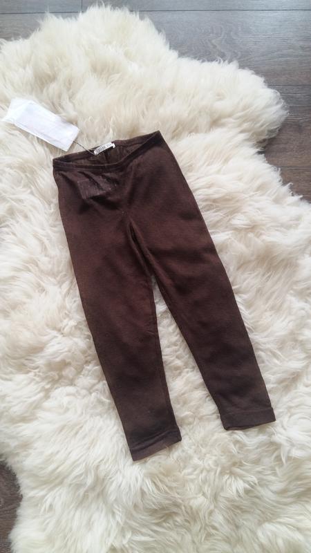 Тоненькі і дуже легкі лосинки шоколадного кольору. Тканина - мелковязаный трикотаж з візерунком. Дуже м'які, відмінно тягнуться. Пояс на резинці. Якість - супер! Розмір на бірці 34 (на ріст приблизно 98-104 см, але легко можна носити до 5 років як укорочені): •загальна довжина - 61 см; •крокова - 41 см; •ПІТ - 24 см (до 31-32 см тягнеться вільно).