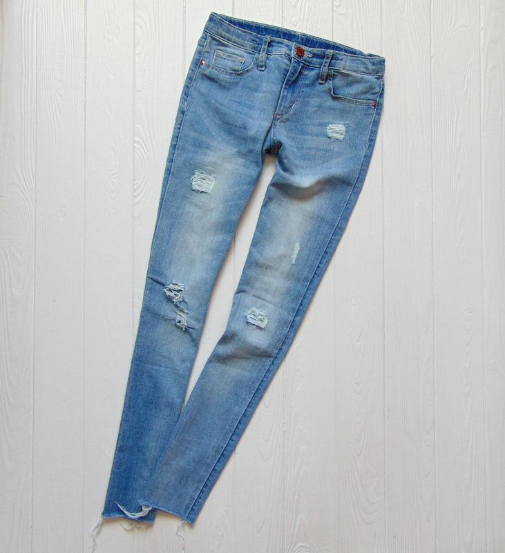 Стильні джинси для дівчинки. Скінні. Дірки і потертості рідні. Низ штанини внизу не оброблений. М'який і приємний до тіла матеріал, тягнеться. Шикарне якість. H&M. Розмір 10-11 років. Стан: нової речі. Склад: 76% бавовна, 22% поліестер, 2% еластан. Заміри: довжина 83 см, кроковий шов 63 см, талія 30Х2 см, тягнеться до 35Х2 см, є стяжка, стегна 35Х2 см, ширина штанини в районі промежини 20 см, ширина штанини внизу 11 см, глибина посадки 21-24 див. Ціна 240 грн.