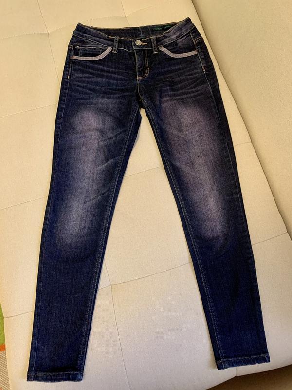 Приобретала в магазине Benetton. Пр-во Камбоджи. Состав на фото. Потертости на фото 6-задумка модели(изначальны). Пояс резинка утяжка, пуговица -обманка кнопка. Посадка низкая. Подойдёт на рост до 152 см. Цвет сине-фиолетовый.