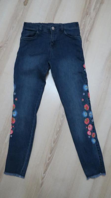 джинси квітковий принт, вишивка F&F 10-11 років. стан як для б.у. відмінне. по боках розшиті квіти. є стяжка. перешлю новою або укр поштою. довжина по попі-84см/ крокова довжина-64см/ посадка по попі-26см/ ширина в поясі-30см в спокійному стані+ трохи тягнеться і можна тягнути.