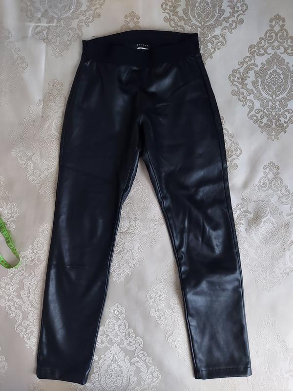 Стильні брюки зі шкірозамінника на широкій резинці. Прямий Фасон, не лосини. Матові, трохи тягнуться. Дефектів немає. Заміри на фото.