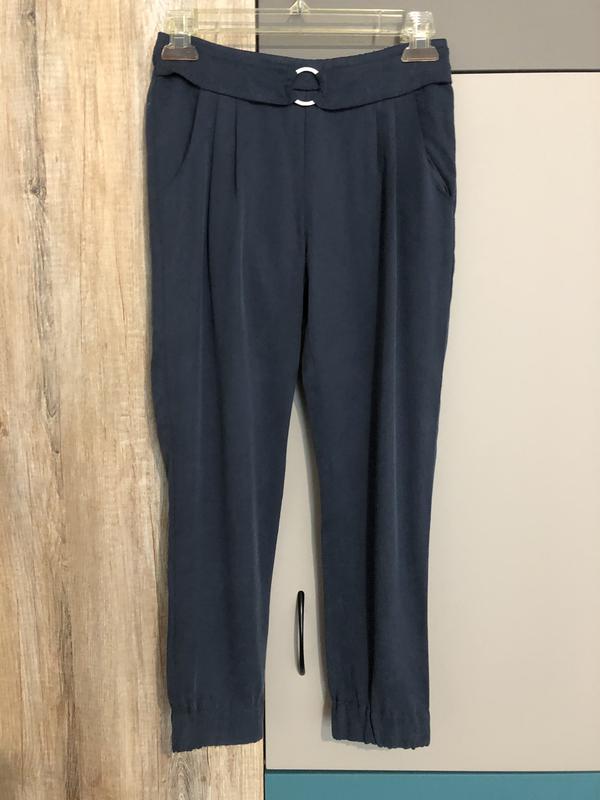 Нові. Легені. Колір темно синій з попелястим відтінком. Приємні на дотик. Ззаду на поясі резинка - фіксатор. Заміри: довжина 80 см, ширина по талії ( в не розтягнутому вигляді) 33 см, ширина по стегнах 47 див. Внизу манжети гумка, завужені донизу. Дуже зручні і красиві.