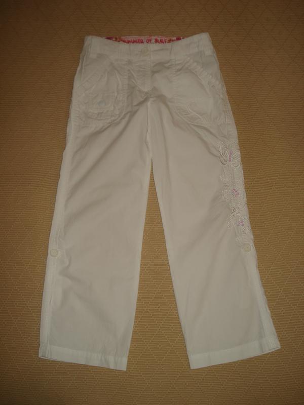 Штани - бриджі Marks & Spencer на дівчинку 8 років Вік: 8 років; зріст: 127 див. Колір - білий. Склад: 100% бавовна. Виробництво - Індія. В області талії - резинка-утяжка. На лівій штанині - вишивка + паєтки - фото №2 Є кілька додаткових фото. Штани - бриджі у відмінному стані. ЗАМІРИ: ПОТ - 31 див Довжина по зовнішньому шву - 71,5 см Довжина по внутрішньому шву - 55 див.