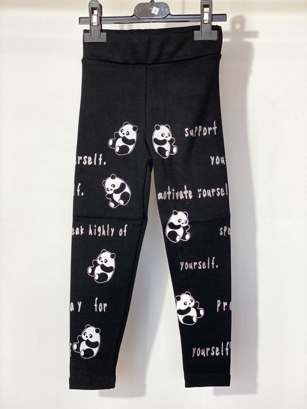 Лосини утеплені на байці для дівчинки 3 роки 98 см, чорного кольору, накатка панди, на широкій резинці в поясі. Дуже красиві лосини! Заміри: довжина 59 м, крок 42 см, пояс полуобхват 22 см.