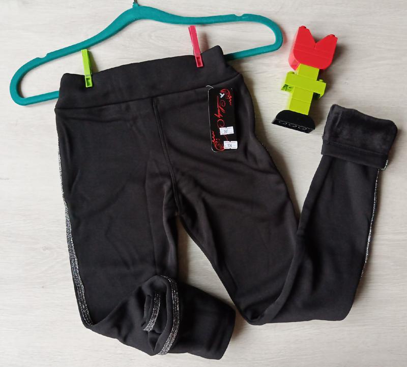 Теплі лосіни для дівчаток. На коротенькому хутрі. Прикрашені сріблястими смугами. Якість відмінна) Виміри (довжина/крок/пояс - пояс в розтягнутому стані): 140-95/71/30-34 см Допустима похибка у вимірюваннях +-1 см