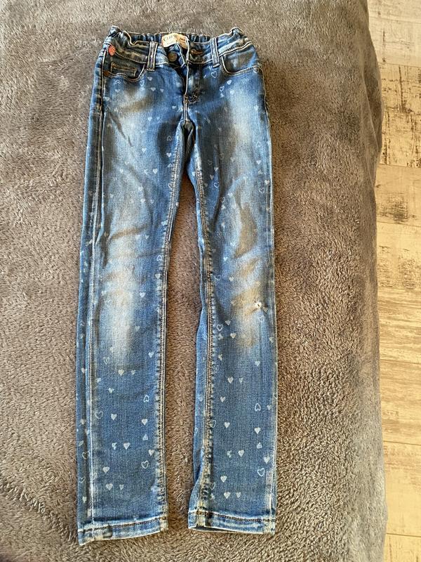 Фото на тілі немає На талії регулюється гумкою -підійде на 5-9 років орієнтуйтеся по замірах Є дві кишені спереду і два ззаду Застібаються на замок блискавку і залізну гудзик Є гачки для ременя Тягучі,щільність середня Світло-синій джинс з сердечками Сліди шкарпетки незначні на фото видно (не критично) Довжина 78 см) Піт 28 см) Побіди 36 см) Висота посадки попереду 16,5 см) Висота посадки ззаду 25,5 см) Напівобхват знизу однієї штанини 12 см) Кроковий 59,5 см)