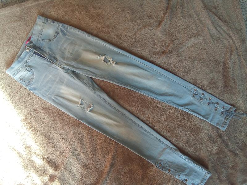 Рвані джинси на худеньку , довгоногу дівчинку . Тягнуться . Довжина по боковому шву - 93 см , крок - 71 см , ширина пояса - 28 см , глибина перед - 22 см . Загальний стан дуже гарний .