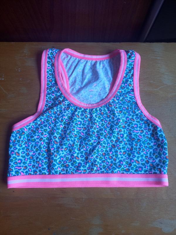 топ кольоровий з рожевими резинками, новий , обхват по низу 54 см , приблизно на 8-9 років. Чорний злегка б/в в подарунок.