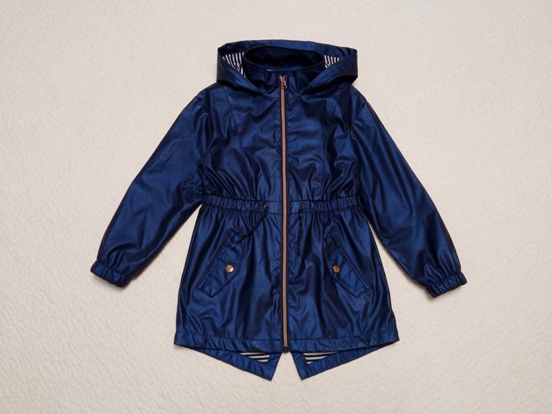 Куртка дуже гарного синього перламутрового кольору. Кармани на кнопках. На поясі куліска. Є нюанси: підкладка покаталася і є маленькі подряпинам на рукаві і капюшоні (дивіться на останньому фото)