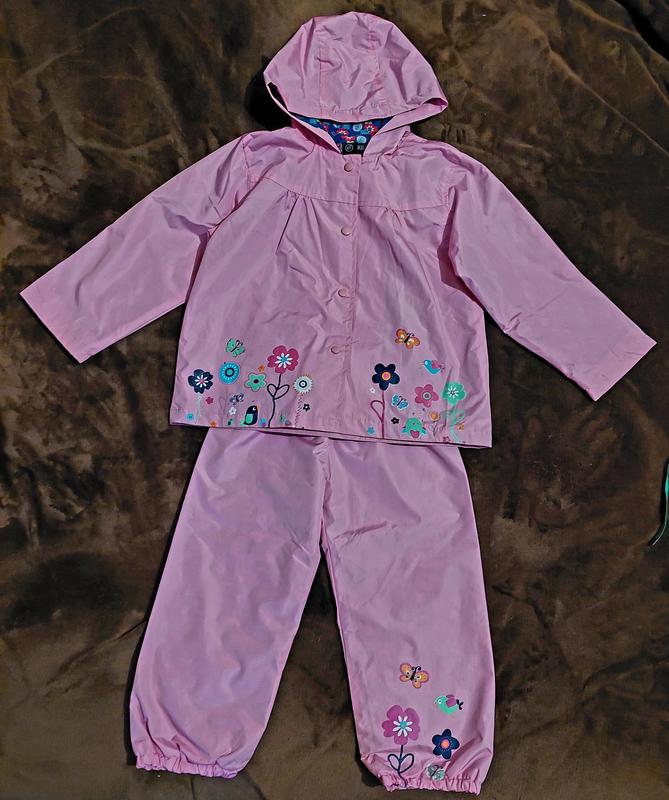 Очень красивый дождевик для девочки - брючки и курточка.Яркая розовая основа с цветочным принтом.Курточка на кокетке от груди. Состояние идеальное.