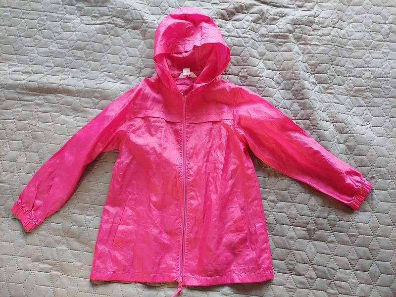 Дощовик рожевого кольору , застібається на змійці, має кишені і каптур