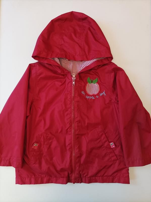 Курточка от дождя, ветровка или дождевик на легкой подкладке. Двойной замочек защищает от дождя и ветра. Красивая вещь, с аппликацией яблочко, которое подойдет и для мальчика и для девочки) На последнем фото показала, что не вымылся гель для стирки - есть светлые разводы. Еще такая на размер меньше – смотрите в своих товарах. Вдалих покупок!