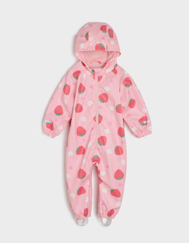 Детский комбинезон-дождевик от бренда Sinsay с ярким принтом клубниц на розовом фоне. Такая модель изготовлена из водоотталкивающего материала и имеет капюшон, эластичные манжеты и штрипки (резинки) для фиксации на обуви, что обеспечивает надежную защиту от влаги и грязи во время прогулок. Подкладка флис.