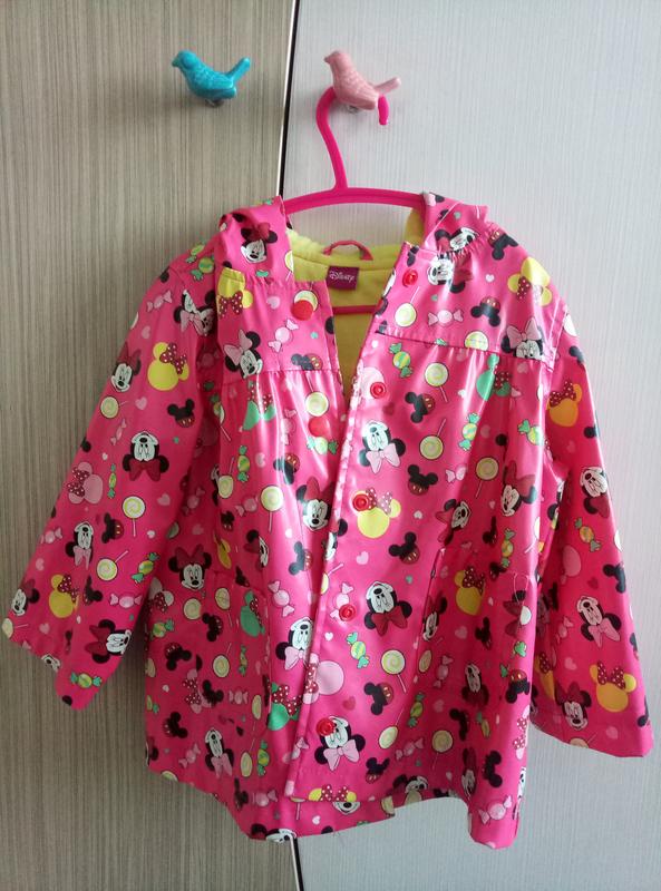 Яркий дождевик с диснеевским персонажем Размер 2T Подкладка ярко-желтая Основной цвет - малиновый Бренд Disney Длина 41 см, длина рукава 31,5-32, пог - 37, это под руками