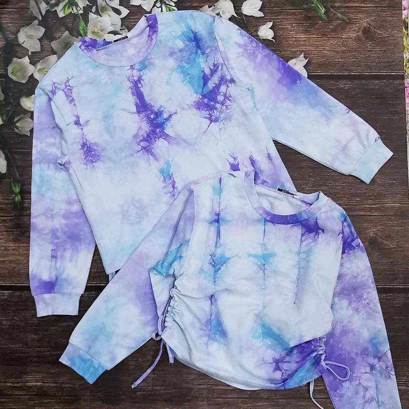 95% хлопок, 5% эластан Свитшот оверсайз в трендовой расцветке тайдай, снизу на регулируемых затяжках 158 - длина 50, рукав от горловины 65, пог 44 164 - длина 55, рукав от горловины 69, пог 46