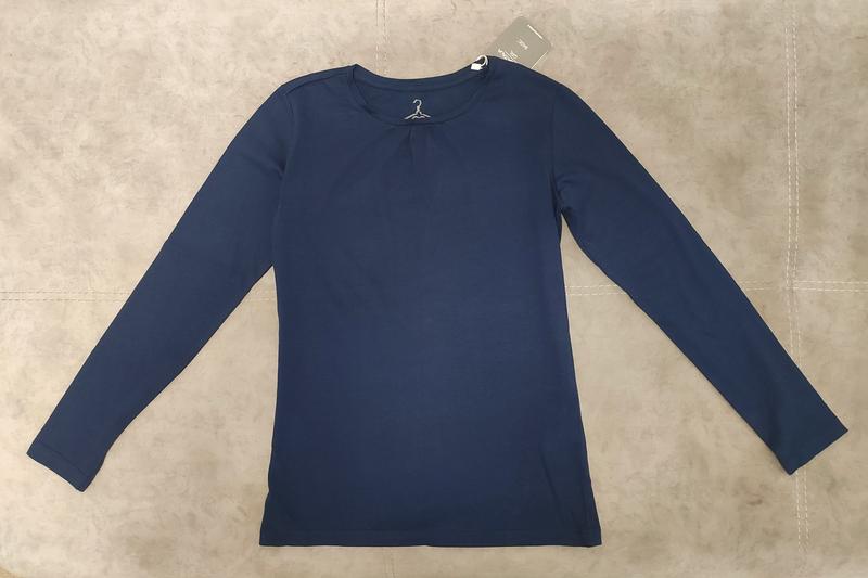Лонгслів для дівчинки темно-синього кольору. Напівобхват 38 см, довжина рукава 55 см, довжина лонгсліва 58 см.