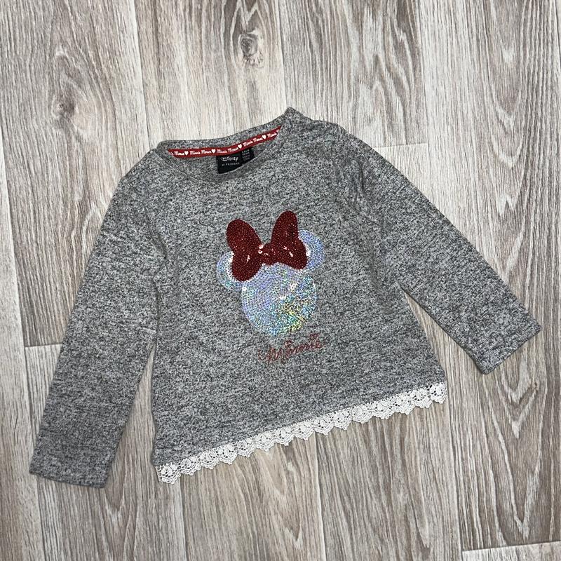 Елегантний сірий джемпер із Мінні Маус і прикрасою у формі рюш внизу — неймовірно стильний вибір для шанувальниць вишуканих деталей. Цей джемпер поєднує в собі затишок сірого кольору, чарівність Мінні Маус і жіночні рюші, створюючи неповторний і привабливий образ для стилю вашої дитини. 5-6 років Дісней primark довжина 39. ПОГ 31. рукав 36