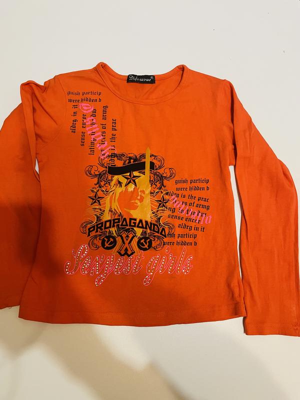 Лонгслів з принтами та стразами. Склад: 90% - бавовна, 10% - поліестер. Заміри: ОГ - 72 Рукав - 44,8 Довжина - 42. Стан: ідеальний.