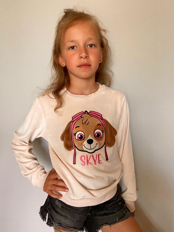 дитячий светр-джемпер з аплікацією для дівчинки на вік 8-9 років на зріст 134 см світло пудреного кольору. З дуже м'якого, дуже високої якості велюру Довжина виробу по спинці 50 см Ширина по грудях 42 см