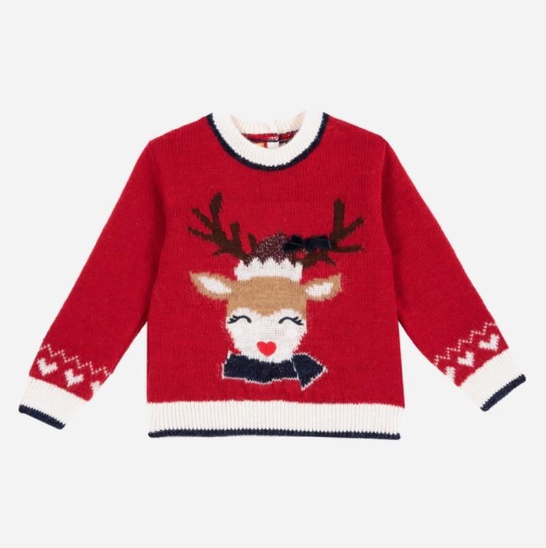Новорічний джемпер для дівчинки червоного кольору з зображенням оленя Склад: 80% акрил, 10% лана, 5% віскоза, 5% вовна