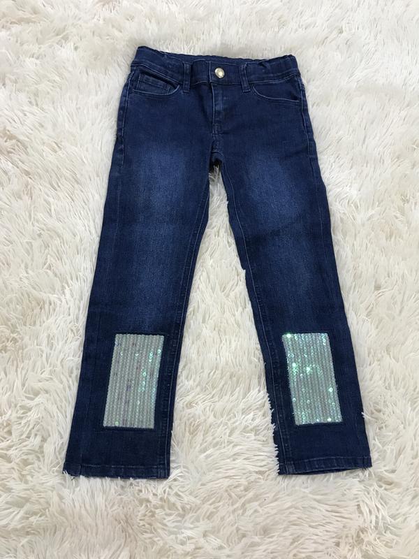 Джинси для дівчинки. Джинси на поясі, застібаються на змійку і закльопку , є регулятор обсягу. Зпереду кишені. На ніжках паєткі. Виглядає дуже романтично. Джинс щільний, стрейчевий Розмір - 3/4/5 роки дивіться виміри. Заміри: Розмір 4 - довжина - 66 см., крок - 48 см., напівобхват в стегнах - 32/36 см, пояс 28/32 см, посадка 18 см