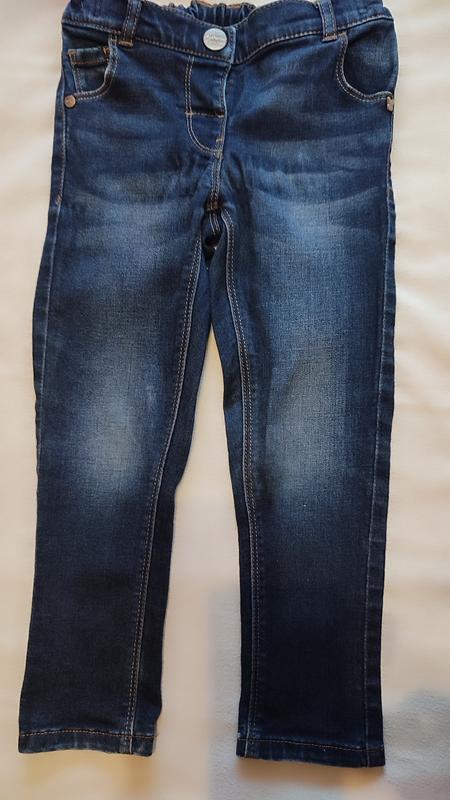 Джинси для дівчинки з метеликом від Next. Зріст вказано 104 см, на вік 3-4 роки. Заміри на фото. Загальна довжина 58 см. В поясі є утяжка. На колінках є невеликі плями. Джинс темний, тому майже не помітно. Склад тканини на фото.