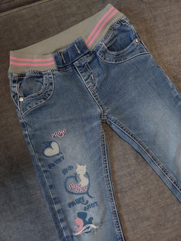 Джинси на дівчинку. Розмір: 5 років. Є чотири кишені. На резинці. Зверніть увагу на заміри: довжина 63,5 см ПОТ 27 см, тягнеться до 34 см ПОБ 33 см посадка 18/25,5 см крок 46 см !!!Дефекти: присутні плями!!! Можу зробити додаткові фото і заміри. Відправка Укрпоштою і Новою поштою.