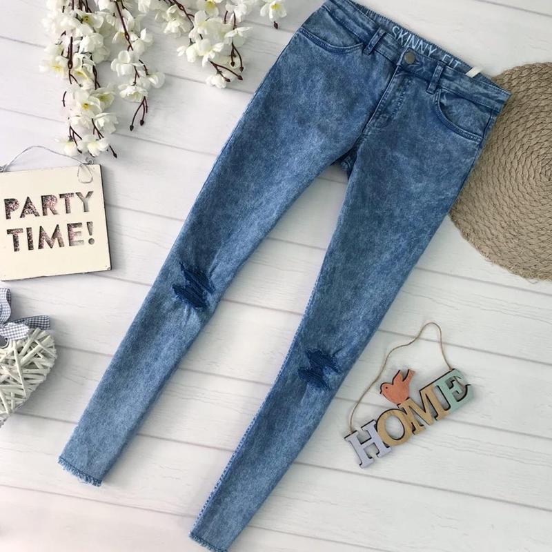 9/10 лет. Джинсы стрейч,рваные на коленях длина 77 см, пояс 30 см, бедра 37 см, шаг 58 см.