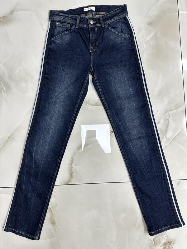 Джинси з лампасами з боків. Стан чудовий. Розмір 144-155 см. Заміри на фото. Бирка зі складом зрізана, джинс щільний, але з еластаном тягнеться.