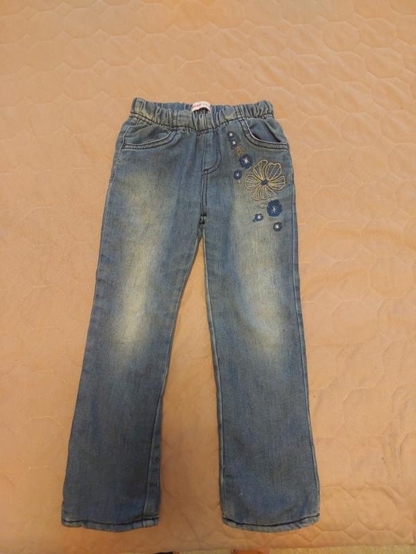 Теплые девчачьи джинсы на флисе,хорошая стан, на одном фото отразила, что на одном колене есть маленькая царапина эли заметная.Длина 62см,по талии 25см.На возраст 3-4роков