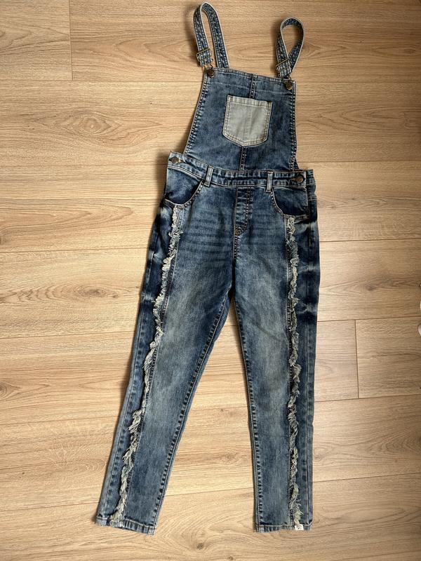 Очень качественный джинсовый комбинезон. Джинс измерения плотный, немного тянется. Длина регулируется бретельками. Замеры: длина максимально 123 см, шаг 62 см, пояс 36 см, бедра -43 см.